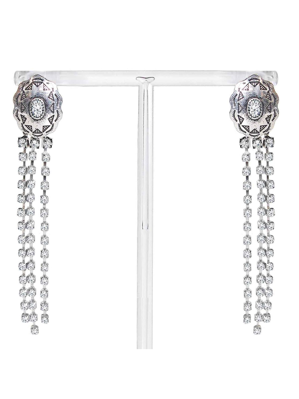 Western roots, glam finish.These statement earrings pair classic concho style with bold rhinestone fringe for the ultimate Western-glam mashup. The silver-tone concho top features etched details and a sparkling center rhinestone, while three strands of clear rhinestones bring all the shimmer and sway. Etched silver-tone concho with center rhinestone Cascading rhinestone fringe for bold move... read more