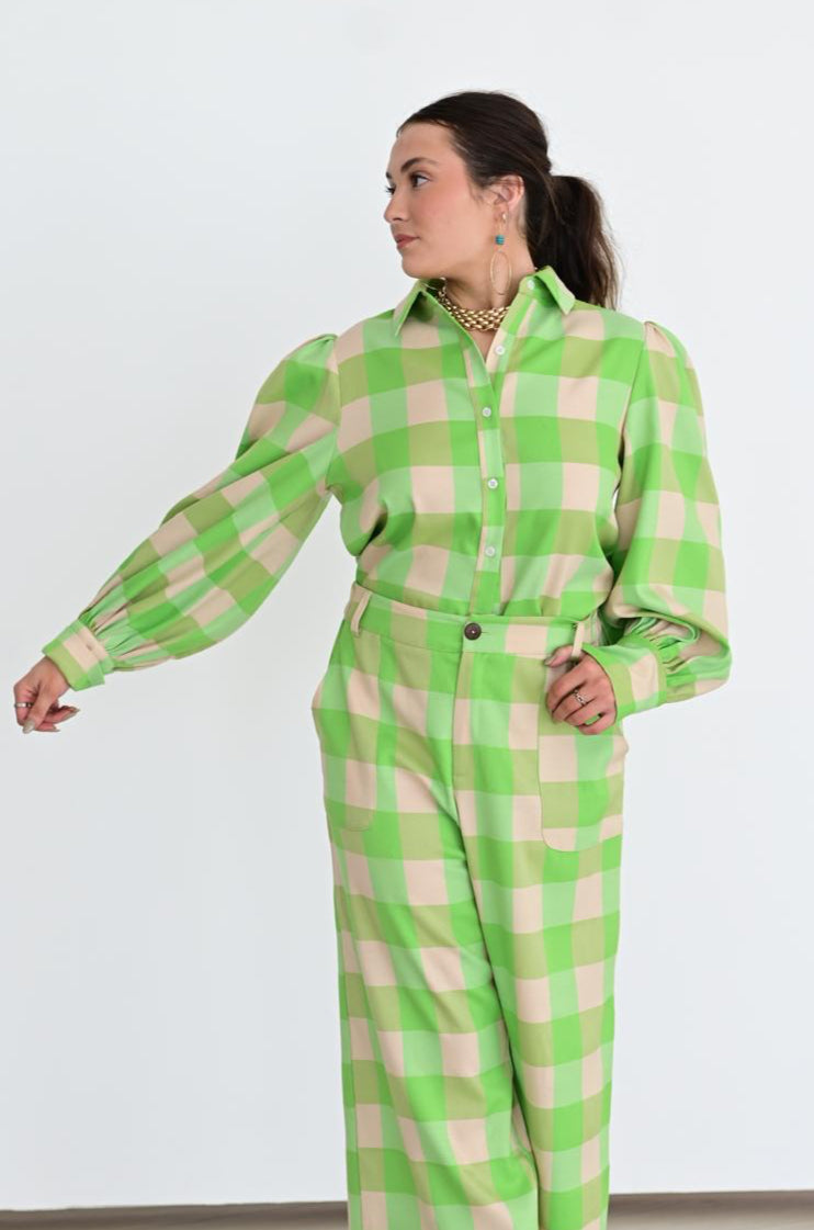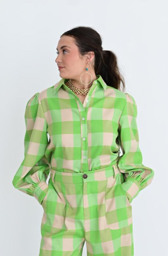 Product Description: This green gingham puff-sleeve top is a fresh and vibrant addition to any wardrobe, perfect for creating a playful and chic country-inspired look. Featuring a classic gingham pattern in a soft green and beige color palette, the shirt boasts puffed long sleeves for a dramatic yet feminine touch. A button-up front and traditional collared neckline provide a polished finish, ... read more
