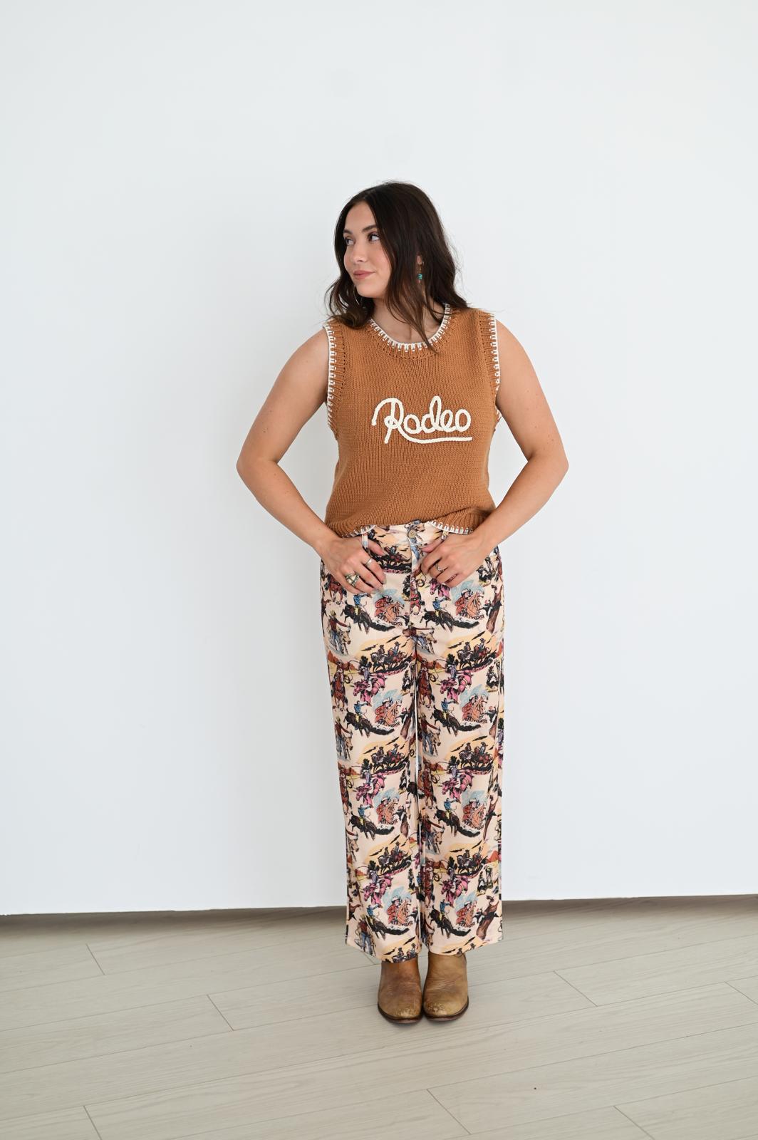 Product Description: "Rodeo" Graphic Knit Sweater Vest Material: Lightweight knit fabric, offering a soft and breathable feel. Color: Rich brown body with contrasting tan "Rodeo" lettering for a Western-inspired statement. Features: Sleeveless sweater vest design, ideal for layering or standalone wear. Contrasting tan stitching detail along the neckline, armholes, and hem for added charact... read more
