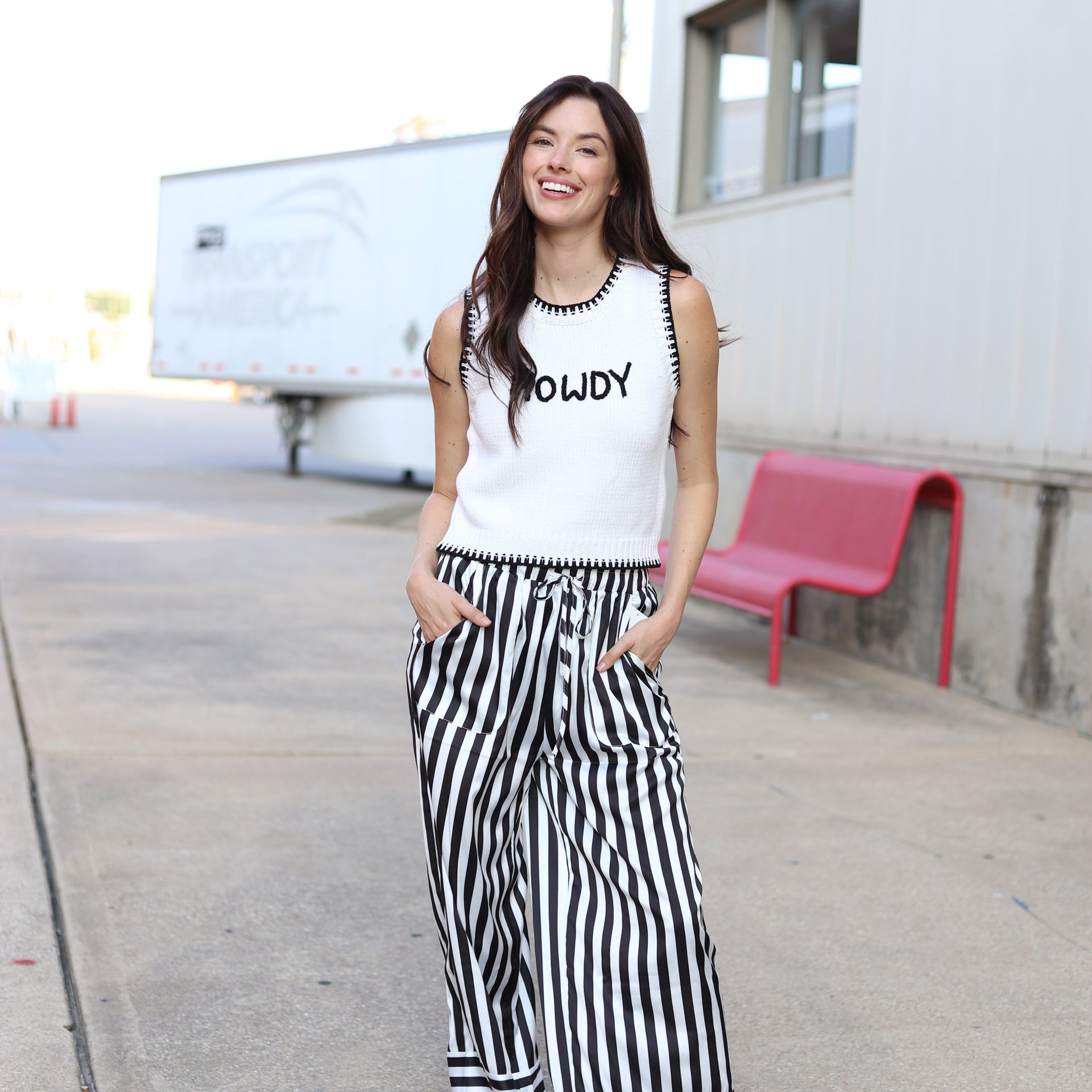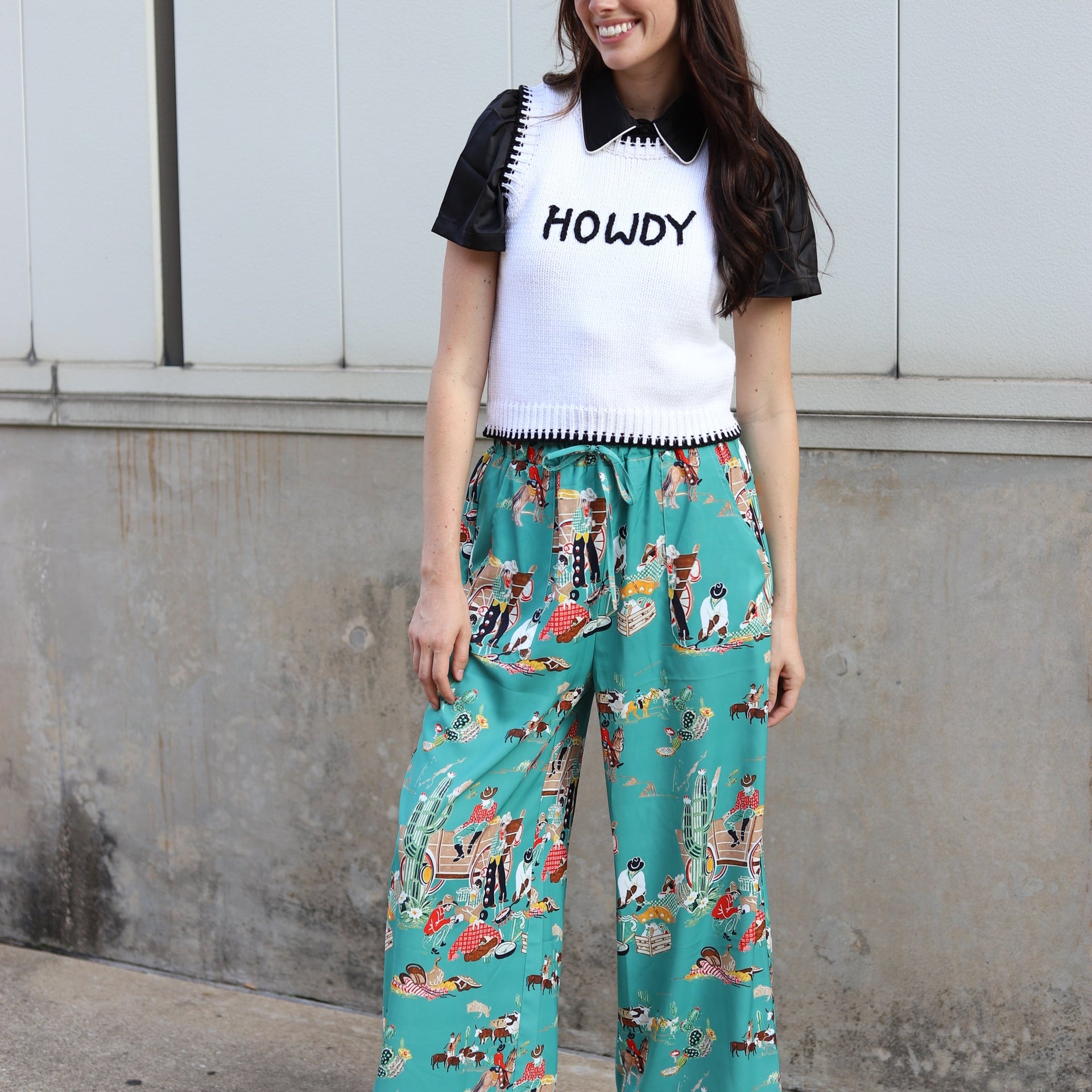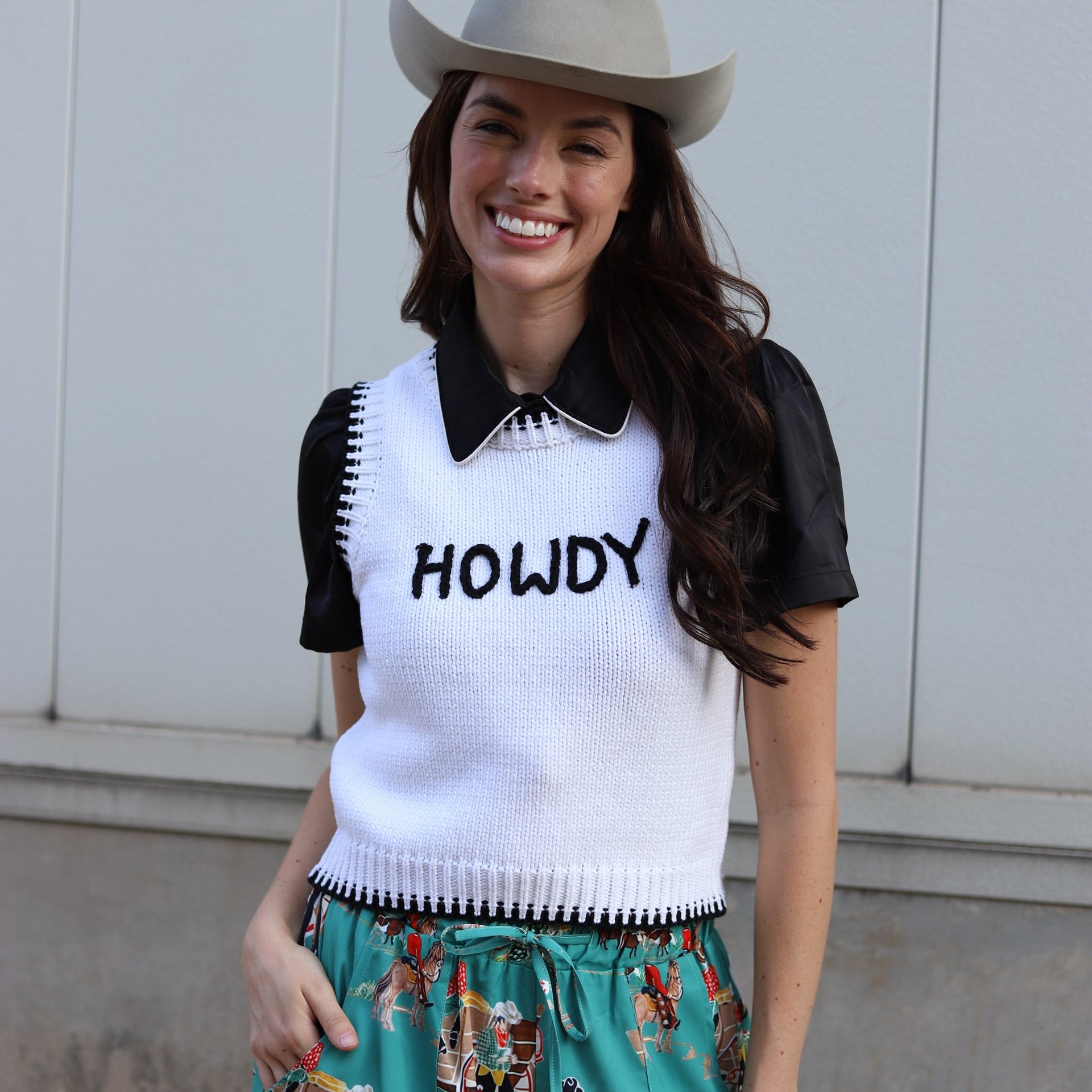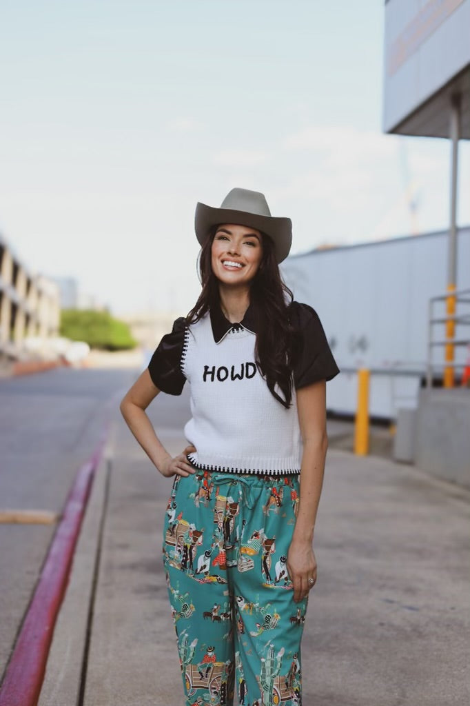 Product Description: This "Howdy" knit pullover sweater adds a playful Western-inspired touch to any outfit with its lightweight and stylish design. Material: Soft, breathable knit fabric, ideal for layering or standalone wear. Fit: Cropped length that sits just at the waist for a flattering silhouette. Design Details: Bold "Howdy" text on the front for a fun statement. Contrasting black h... read more