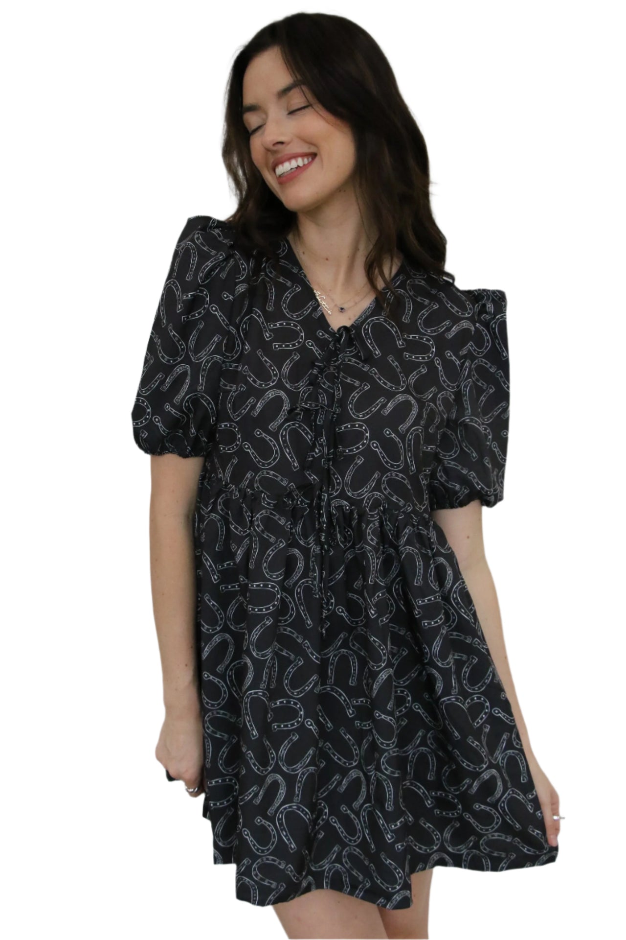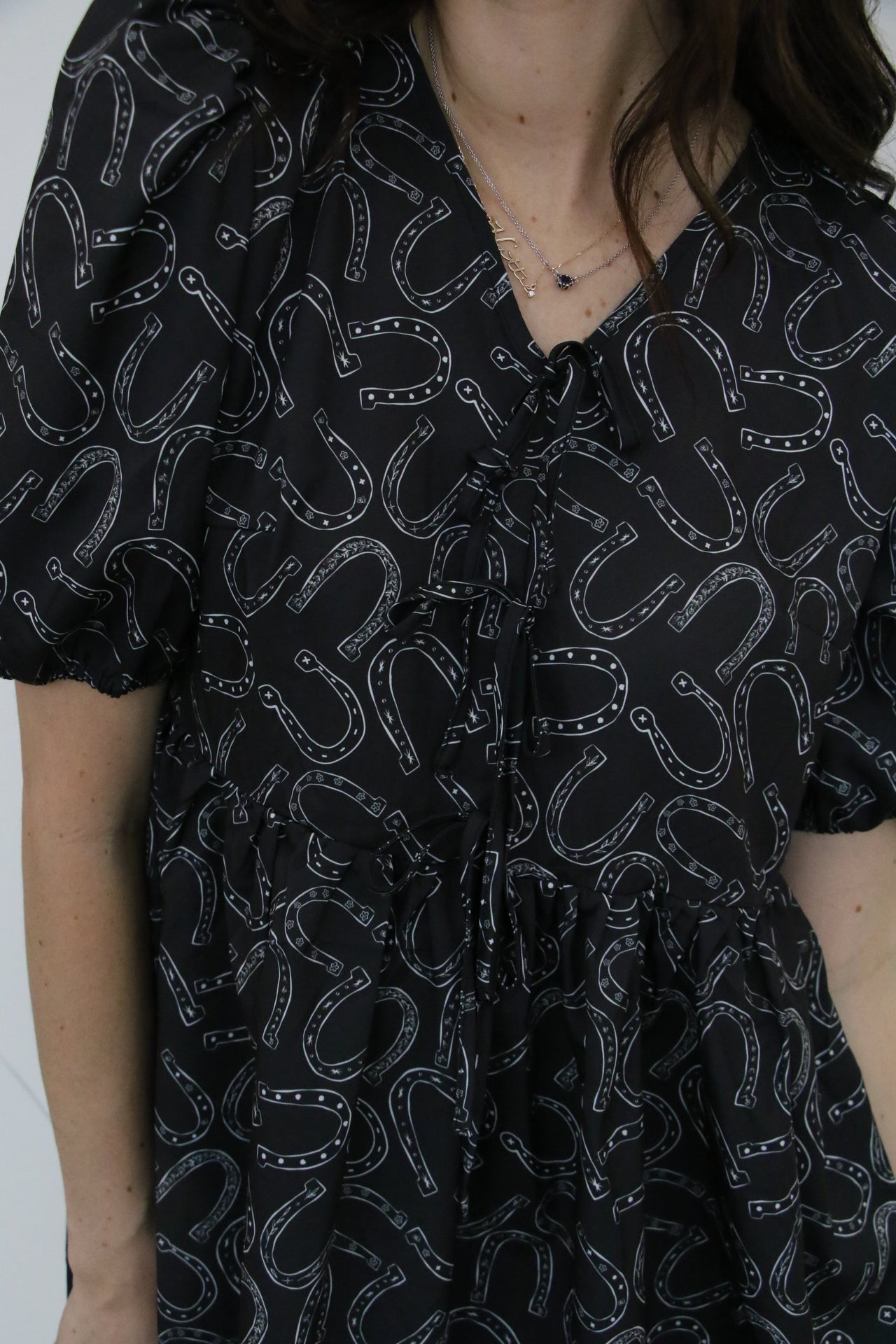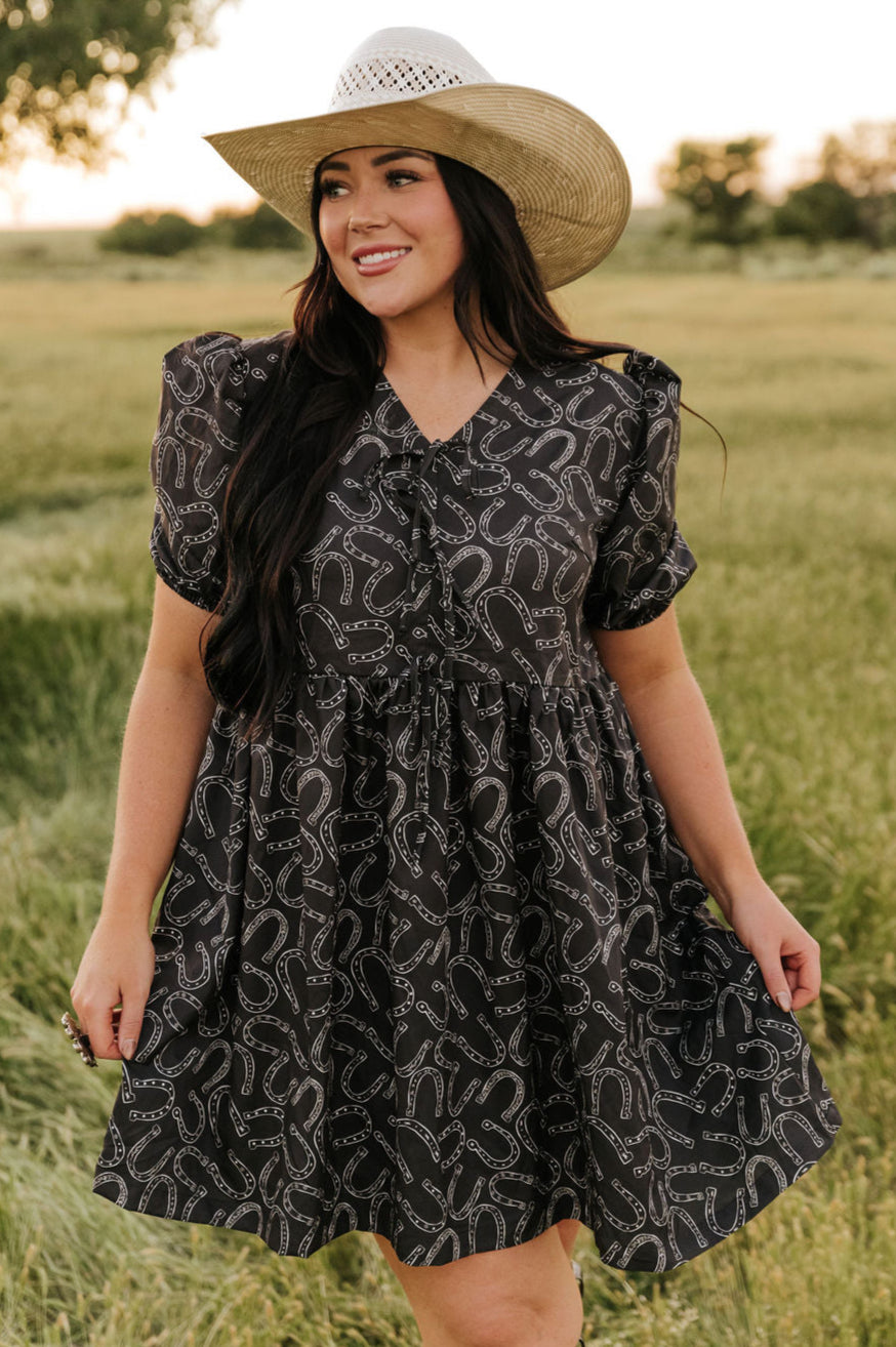 Western Horse Print Dress with Tie-Front Detail This stylish dress brings a touch of western flair to your wardrobe with its black background and white hand-drawn horseshoe print. The modest length and neckline make it a perfect choice for those seeking a chic yet covered look. Featuring three decorative ties at the front and slightly puffed sleeves with elastic cuffs, this dress combines comfo... read more